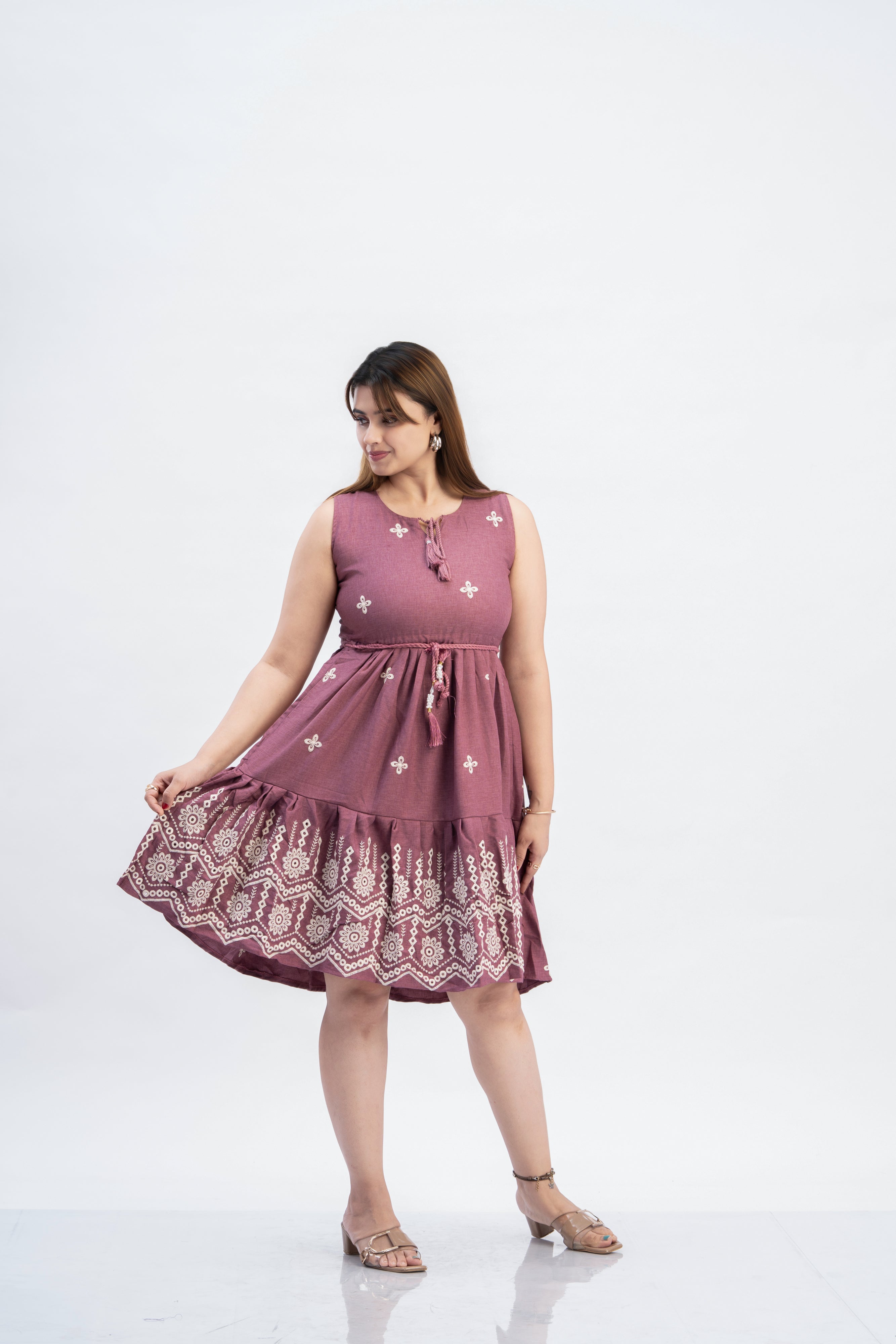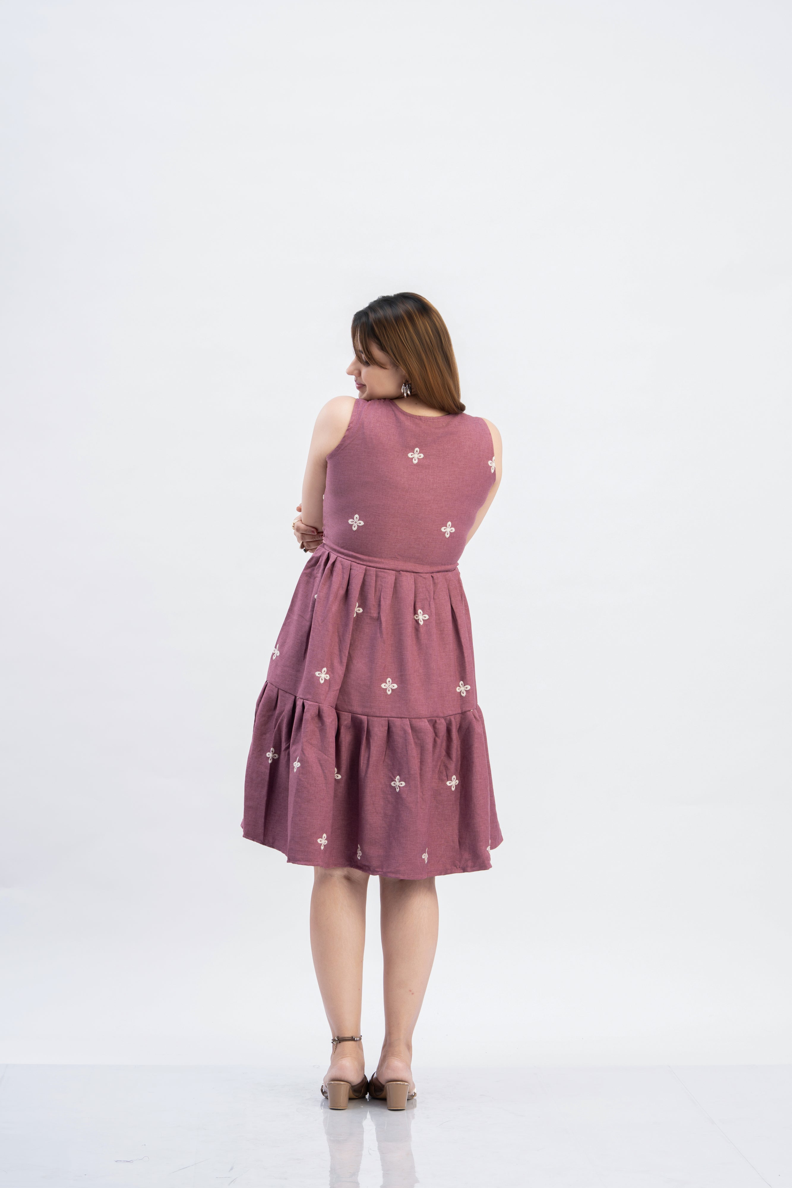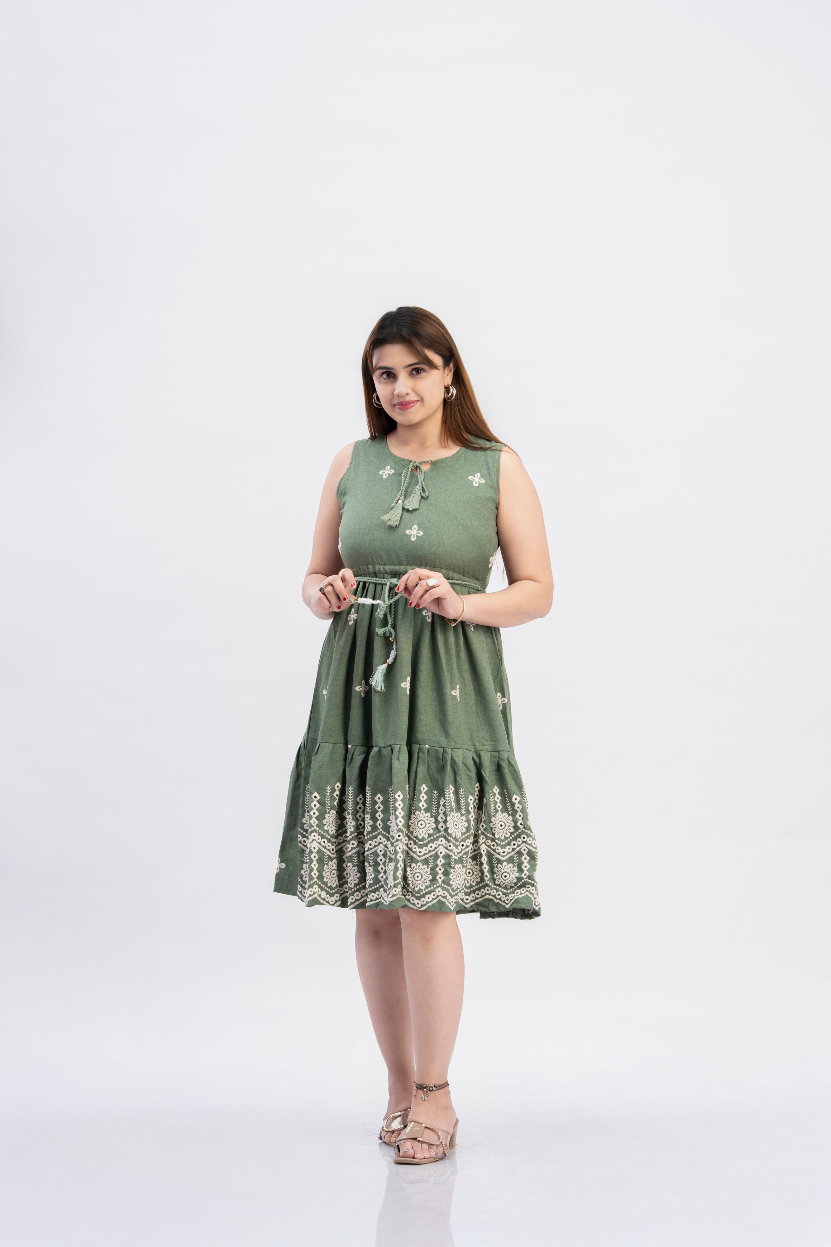 Women’s Embroidered Sleeveless Flared Dress with Attached Inner Sleeve Fabric